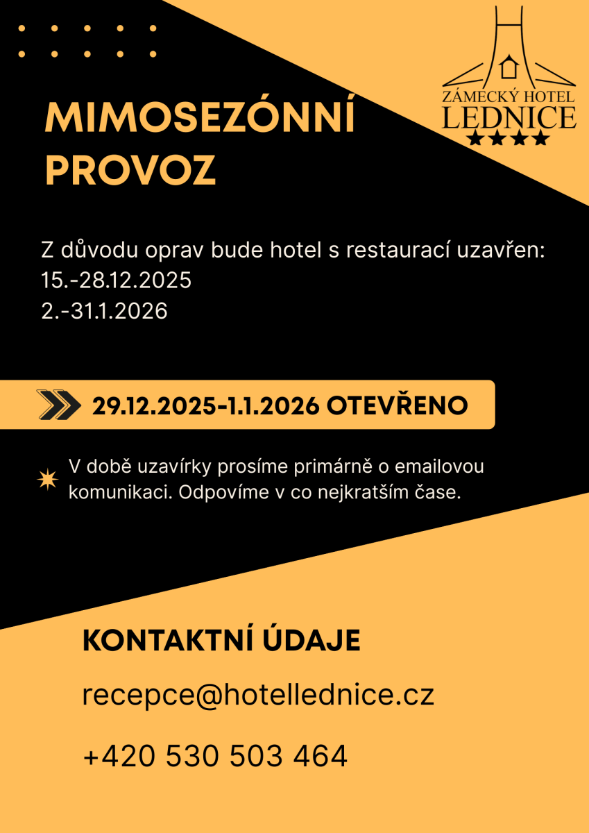 Adresa Zámecké nám. 66, 691 44 Lednice Kontakty recepce@hotellednice.cz Tel: +420 530 503 464
